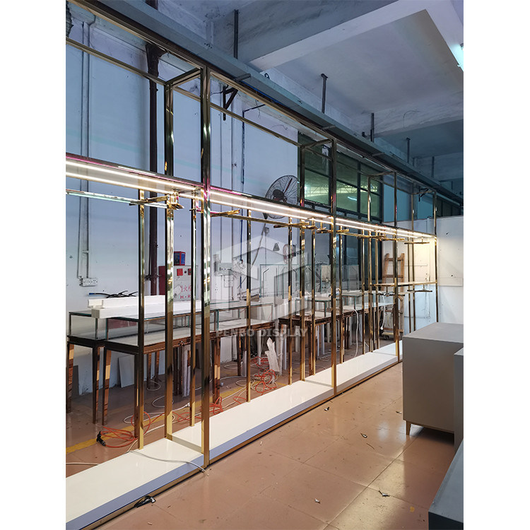 Untuk desain toko ini: Bahan utama: Stainless Steel dengan elektroplat warna yang disesuaikan, dasar kayu lapis tahan api.